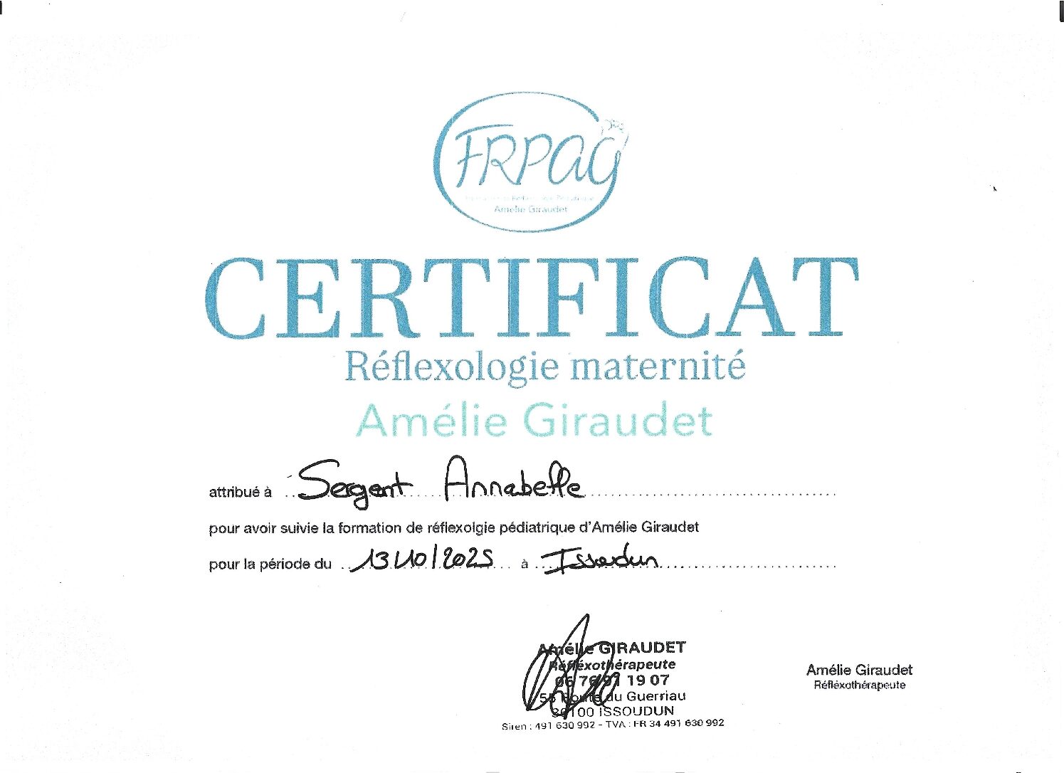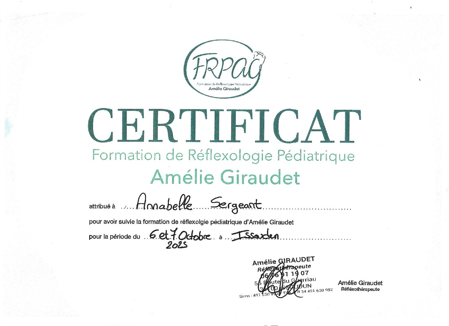 J’ai suivi, en octobre 2025, une formation de réflexologie pédiatrique et une autre de réflexologie femmes enceintes afin de pouvoir prendre en charge les enfants de 0 à 7 ans et les femmes pendant leur grossesse et après l’accouchement.